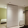 Apartamentul este bine organizat pe cei 40 mp, cu o separare eficientă între living și dormitor printr-un perete tip dressing, care oferă atât intimitate, cât și spațiu suplimentar de depozitare.